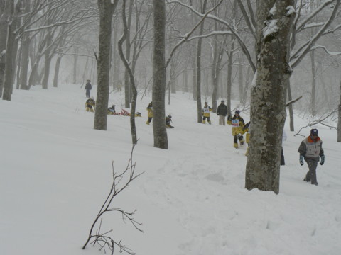 中は、昨夜の新雪でパウダースノー、 木の間をくぐり抜け気分最高、 振り返ると? ちょっとがに股歩き。愛嬌、愛嬌。